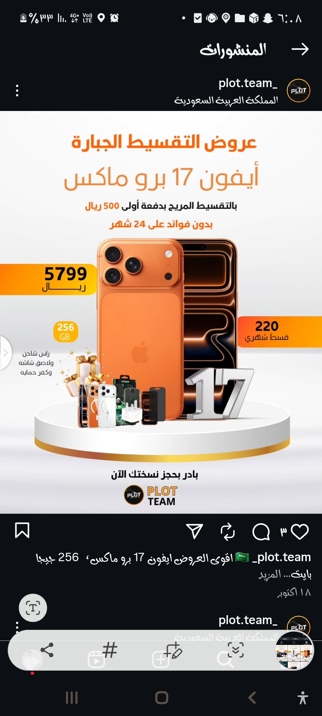 الصورة تعرض إعلانًا لبيع هاتف ذكي مع بعض الإكسسورات الإضافية. هناك بعض العلامات التي يمكن أن تدل على أن الإعلان قد لا يكون موثوقًا تمامًا أو أنه قد يكون عرضة للغِش، مثل: